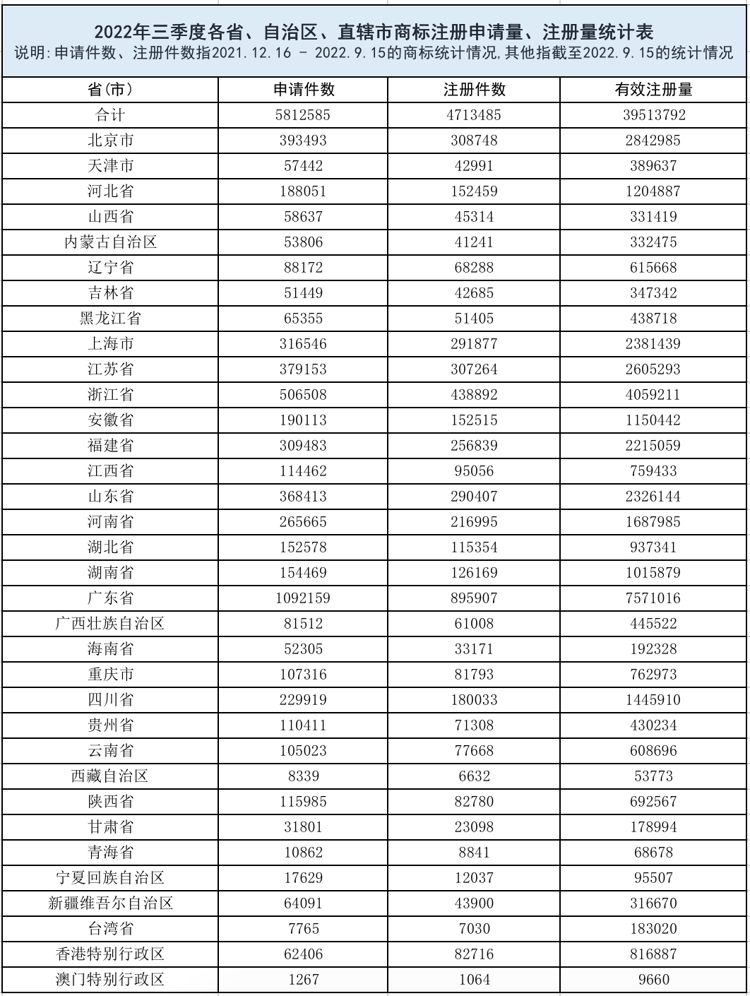 日前,国家知识产权局商标局发布《2022年三季度全国省市县商标主要统计数据》。