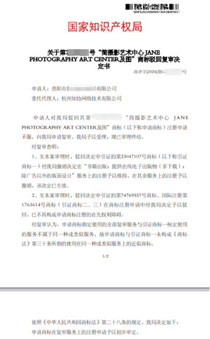 贵阳简约婚纱申请"简摄影"商标被驳回,知协(32.CN)帮助复审,成功注册