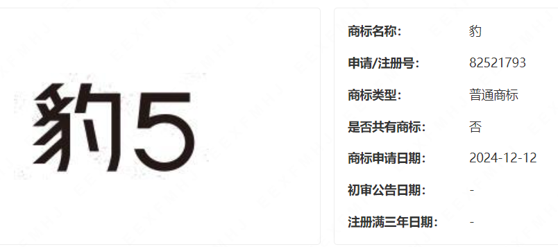 2、近日比亚迪股份有限公司新提交“豹5”“豹8”商标注册申请,类别是第12类-运输工具。