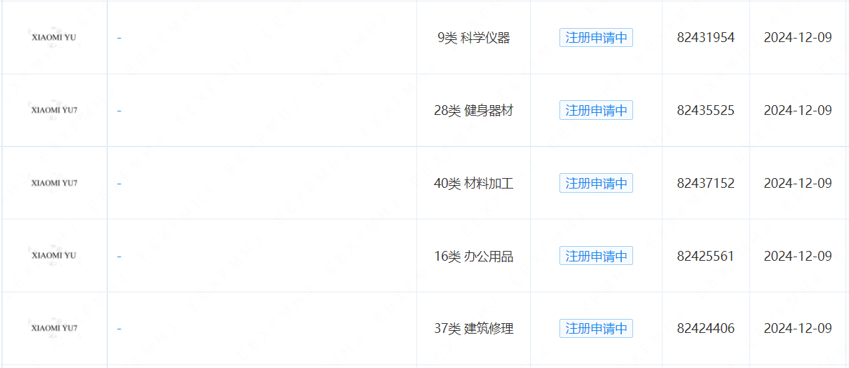 3、小米科技有限责任公司近期申请注册了多枚“XIAOMI YU7”、“XIAOMI YU”商标,国际分类包含运输贮藏、运输工具、科学仪器等,当前这些商标的状态均为等待实质审查。