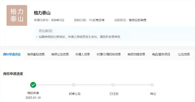 4、格力电器申请注册一枚“格力泰山”商标,国际分类为灯具空调,当前商标状态为等待实质审查。此前格力推出了“泰山”楼宇数智化平台,目前该平台已在办公楼、园区、酒店、医院、轨道交通等5000多个工程中得到应用。