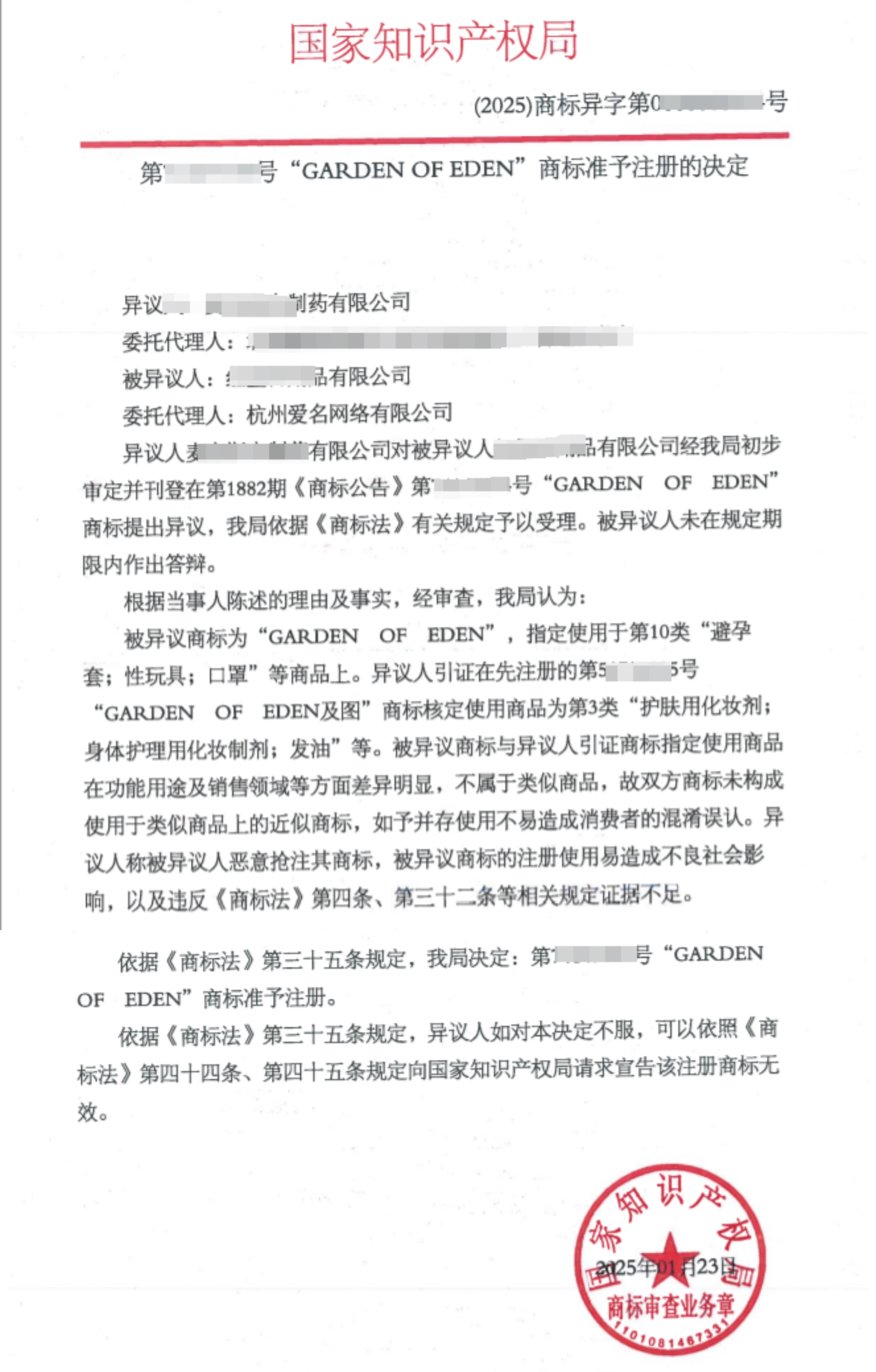 商标局依法决定,被异议商标“GARDEN OF EDEN”准予注册。