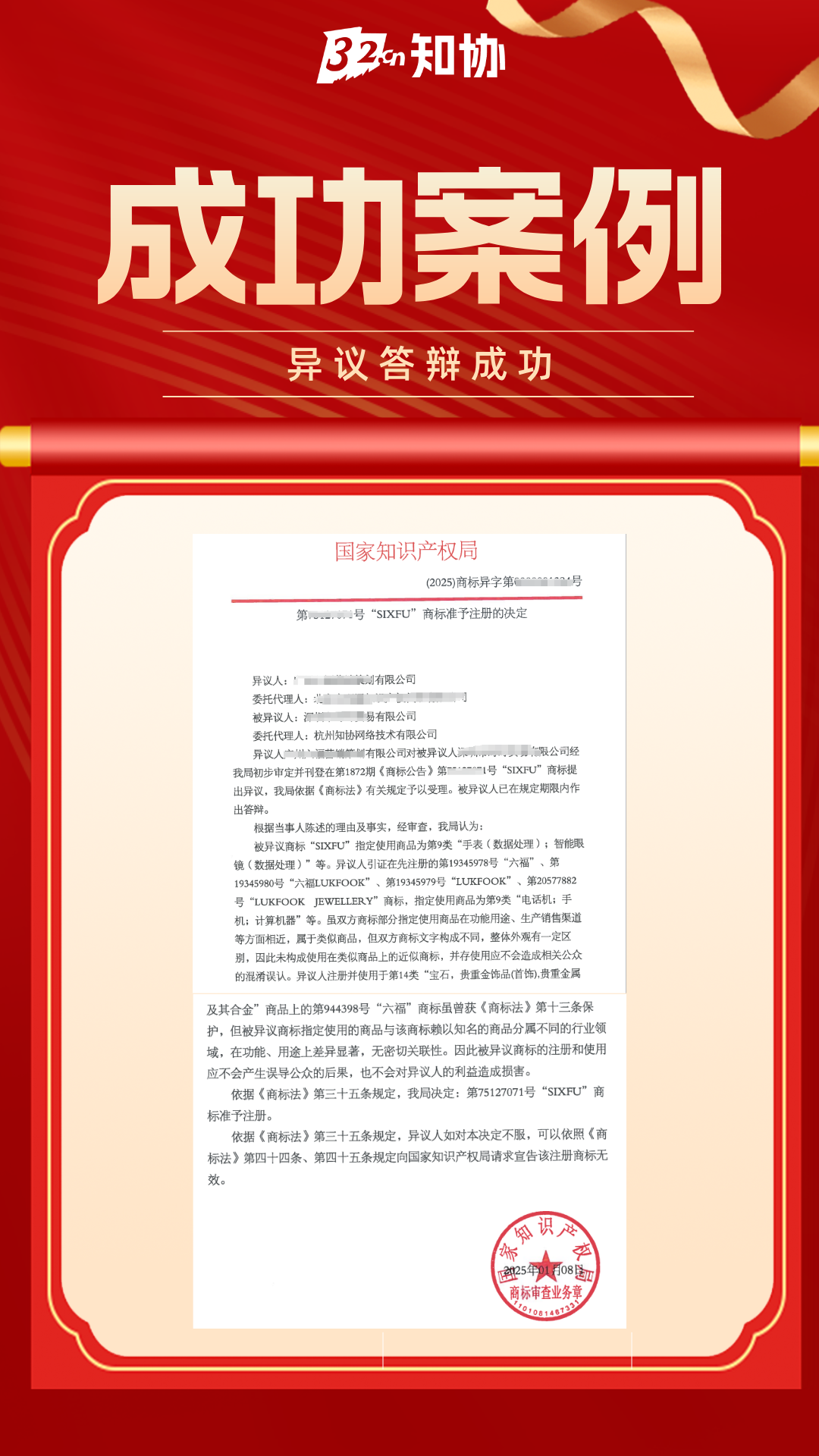 “SIXFU”商标被六福异议,委托知协代理答辩成功注册!