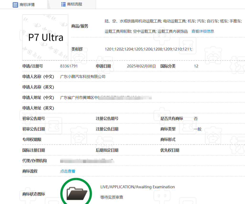2、广东小鹏汽车科技有限公司近日申请注册1枚“P7 Ultra”,国际分类为运输工具,当前商标状态为等待实质审查。