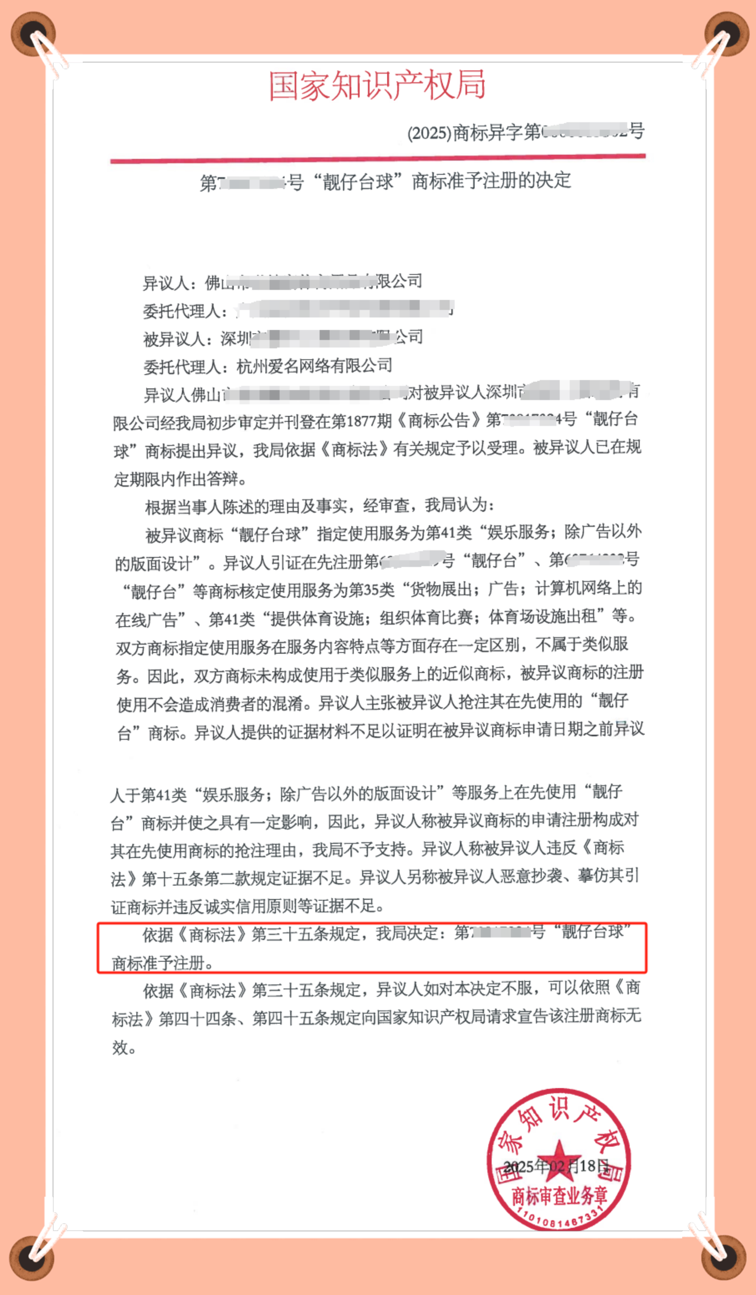 深圳某科技公司申请注册“靓仔台球”被佛山某公司提出异议,商标局下发异议答辩通知书,申请人委托我司进行答辩。近日,答辩结果出炉,商标局对“靓仔台球”商标准予注册。