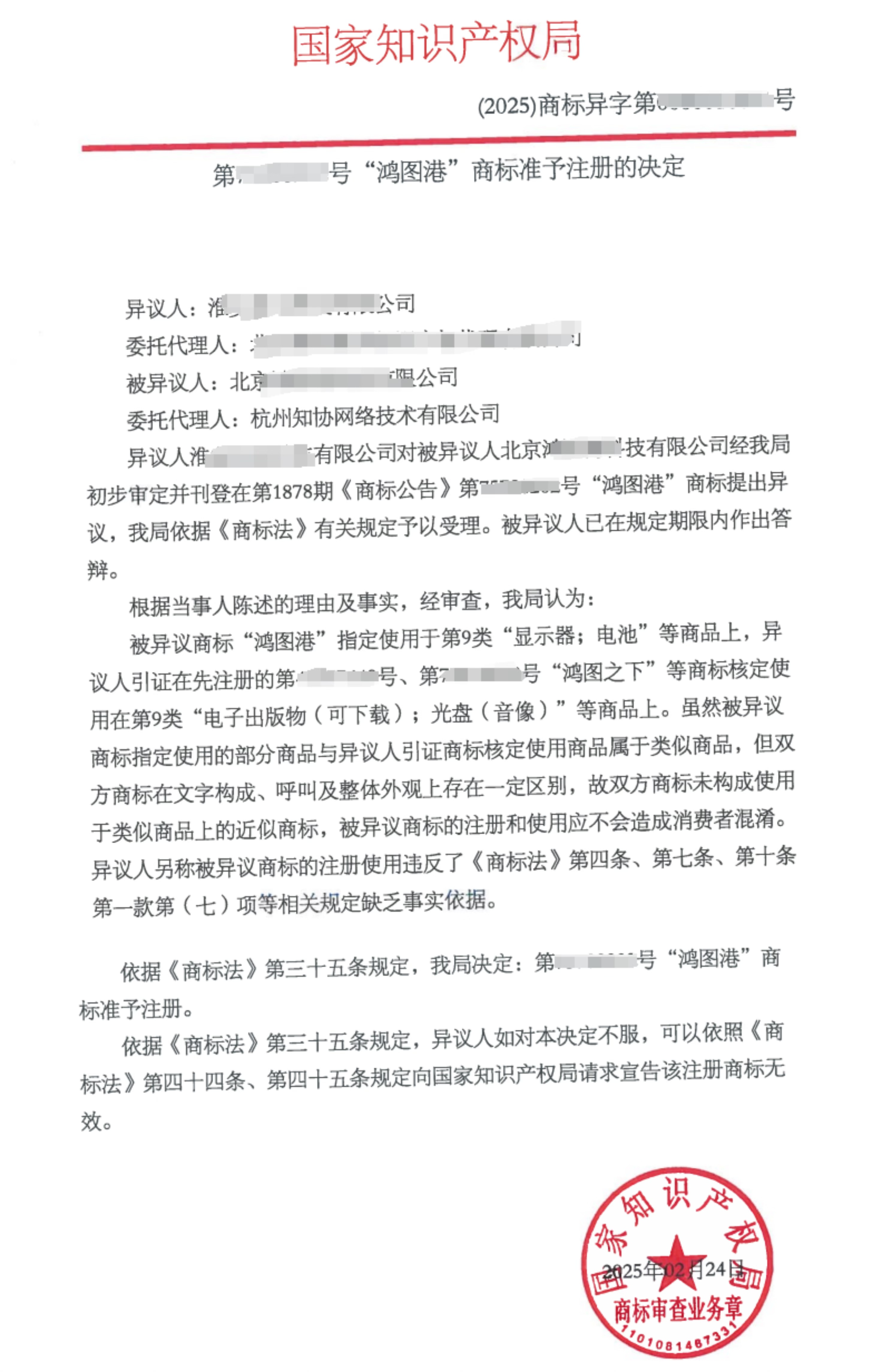 知协助力“鸿图港”商标异议答辩成功,获准注册!
