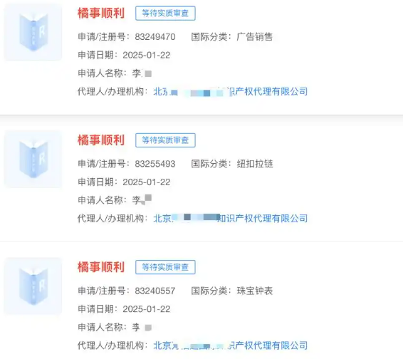 2.据悉,“橘事顺利”被申请注册为商标,申请人为自然人李某,国际分类涉及广告销售、纽扣拉链等,目前上述商标均为等待实质审查。公开信息显示,橘事顺利为鞠婧祎成立的影视文化工作室名字,鞠婧祎担任投资人角色。