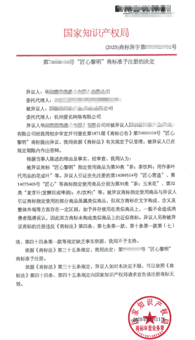 被异议人提交申请了1件“匠心黎明”商标(简称被异议商标),指定使用商品为第30类的“茶;茶饮料;用作茶叶代用品的花或叶”等。