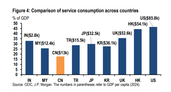摩根大通认为:中国消费的核心短板,不在商品,而在服务业。