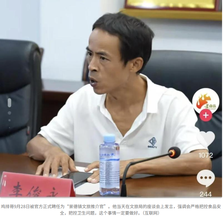 鸡排哥9月28日被官方正式聘任为“景德镇文旅推介官”。他当天在文旅局的座谈会上发言,强调会严格把控食品安全,把控卫生问题,这个事情一定要做好。