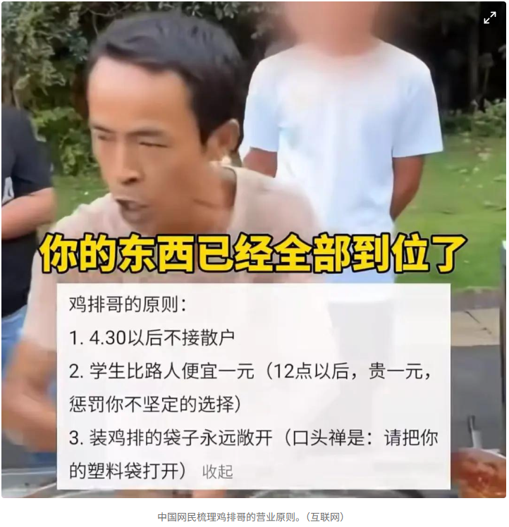 上海广播电视台旗下看看新闻10月2日引述北京大学政府管理学院教授马亮分析,鸡排哥的爆火既有偶然性也有必然性,当预制菜与连锁店盛行时,他坚持现做现卖、限购公平,用幽默传递情绪的小摊贩,成了城市烟火的精神地标。当顾客纠结买不买,他一句”别亏待自己的肚子”,像朋友般唠嗑,说到了人们心坎里。