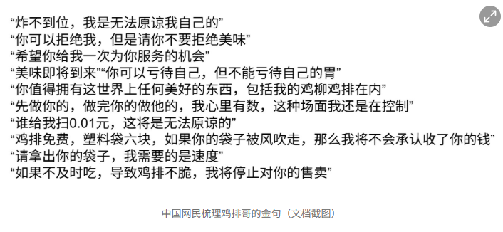 评论指鸡排哥从来“不玩虚的”,令很多人会心一笑的幽默感背后,其实是他给顾客带来的情绪满足,他对顾客期待的深刻理解,还有他虽然手忙脚乱但非常严肃、认真的服务态度。
