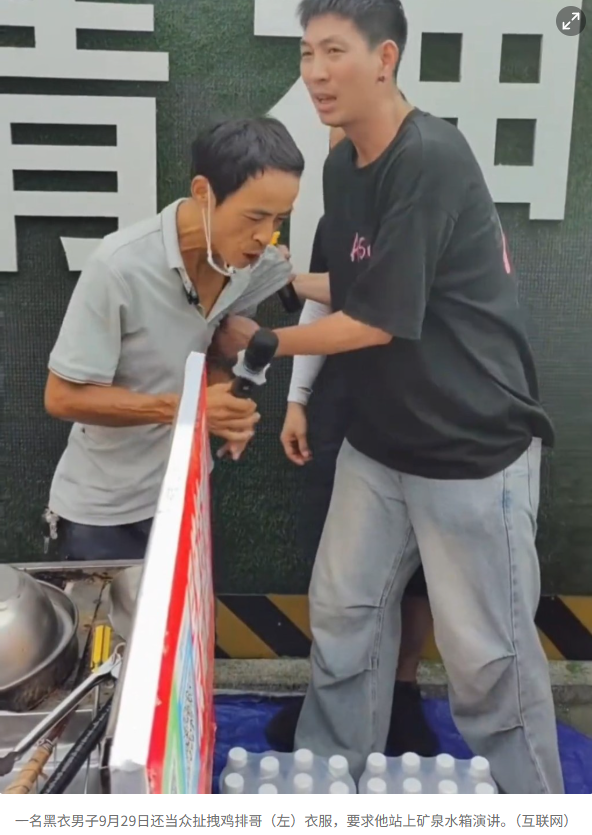 目前“鸡排哥”每天出摊,都要面对近几十个镜头的围追堵截,一名黑衣男子9月29日还当众扯拽鸡排哥衣服,要求他站上矿泉水箱演讲。网络视频显示,鸡排哥当时以“不安全”“尊重饮用水”为由多次明确拒绝,并后退躲避,但男子仍不依不饶持续拉扯,最终在工作人员劝阻下,才让鸡排哥解困。