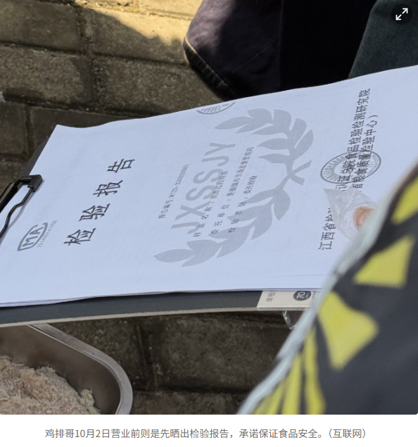 另有顾客发现鸡排哥使用非转基因大豆油炸鸡,质疑“大豆油不适合高温反复油炸”。鸡排哥10月2日营业前则是先晒出检验报告,承诺保证食品安全。