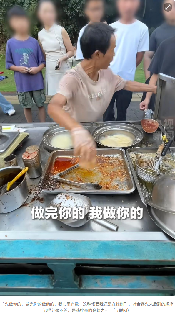 尽管人潮络绎不绝,鸡排哥仍边炸鸡排边直播,口中还不时询问顾客口味、协调排队秩序,动作井然有序,人多不乱。“先做你的,做完你的做他的,我心里有数,这种场面我还是在控制”,对食客先来后到的顺序记得分毫不差,是这名摊贩的金句之一。