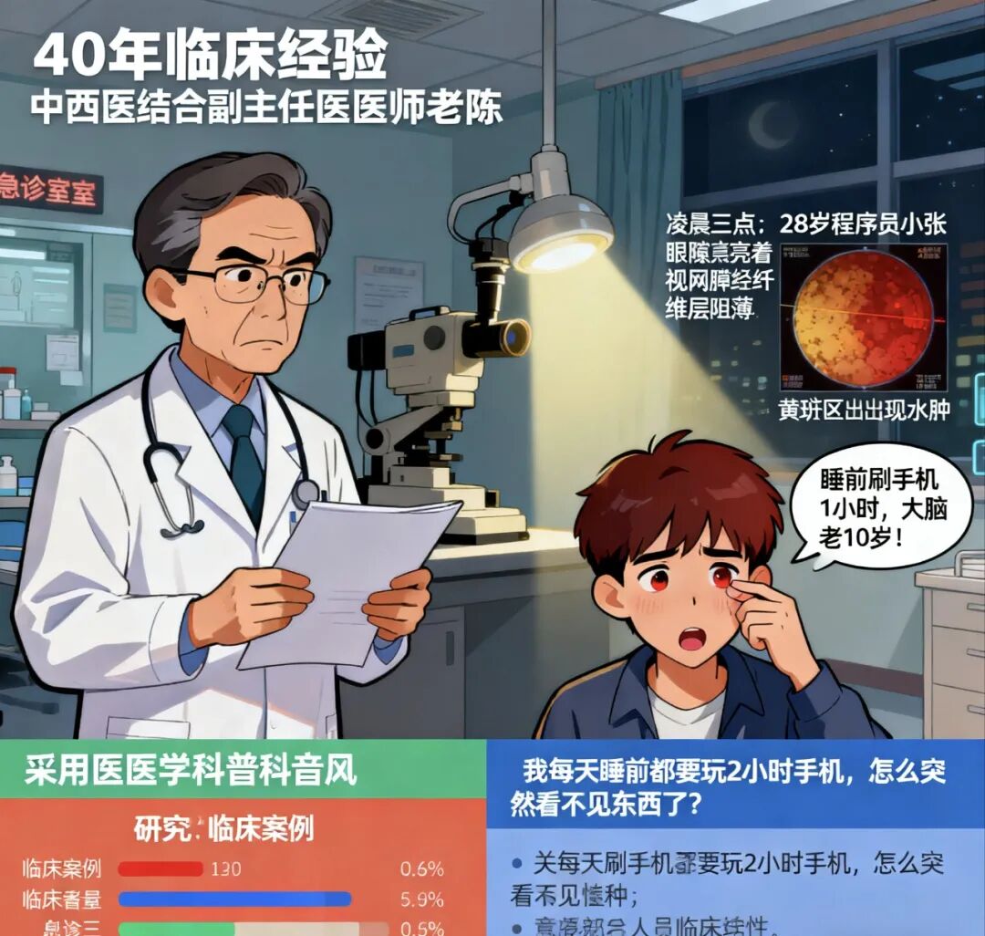 凌晨三点,28岁患者眼底检查显示:视网膜神经纤维层变薄,黄斑区水肿。他揉着发红的眼睛说:"我每天睡前都要玩2小时手机,怎么突然看不见东西了?"哈佛医学院《临床睡眠医学杂志》2023年研究证实:睡前接触蓝光1小时,褪黑素分泌减少23%,可能加速大脑老化!