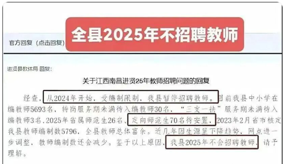 不久前,江西万年县就暂停小学教师岗的招聘,并明确表示近期不再公开续招相关岗位。
