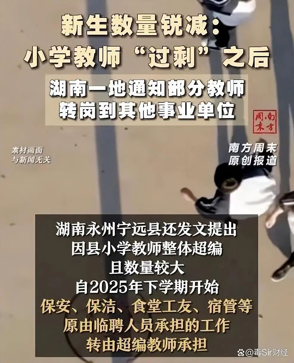 比如湖南永州宁远县就决定将冗余的小学教师编入宿管、保安甚至保洁的队伍中。