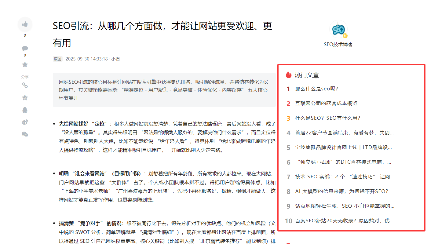 - 标题与内容呈现:网站标题需兼具吸引力与相关性,既要用 “有技术含量” 的表述吸引用户点击,又不能偏离文章主题;优质文章需放在网站显眼位置(如首页 Banner 下方、核心栏目顶部),提升曝光率;内容布局需分段清晰,避免大段文字堆砌,提升可读性。