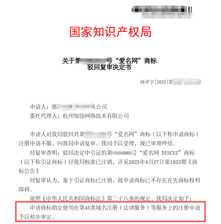 浙江贰贰网络申请“爱名网”商标遭驳回,知协助力复审成功