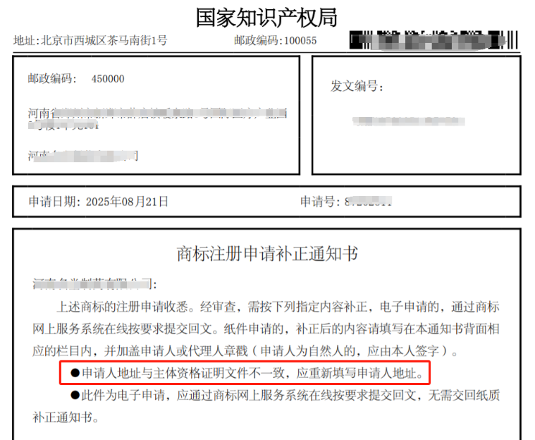 ②申请人地址与主体资格证明文件不一致,应重新填写申请人地址。