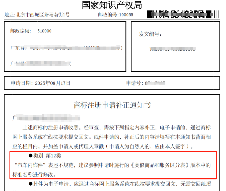 ①“汽车内饰件”表述不规范,建议参照申请时施行的《类似商品和服务区分表》版本中的标准名称进行修改。