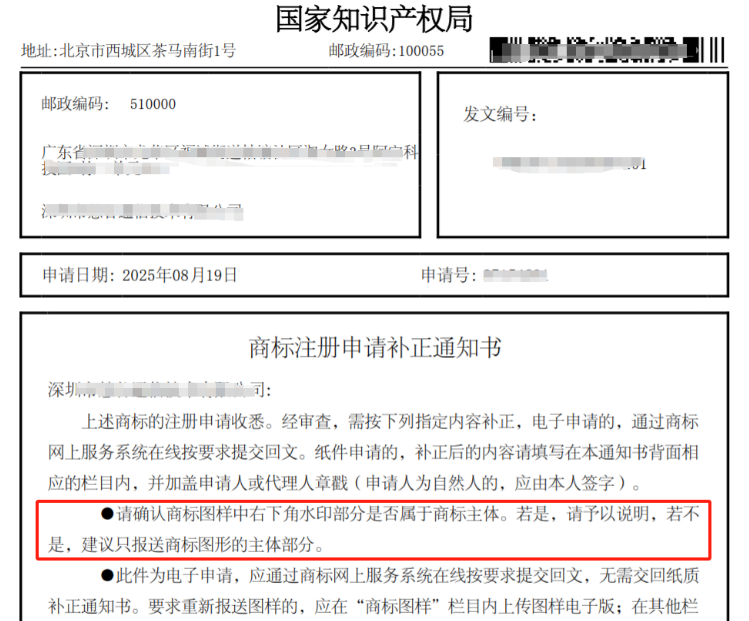 ②请确认商标图样中右下角水印部分是否属于商标主体。若是,请予以说明,若不是,建议只报送商标图形的主体部分。