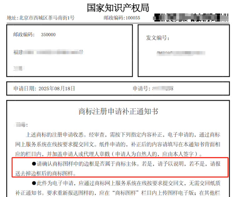 ③请确认商标图样中的边框是否属于商标主体。若是,请予以说明,若不是,请报送去掉边框后的商标图样。