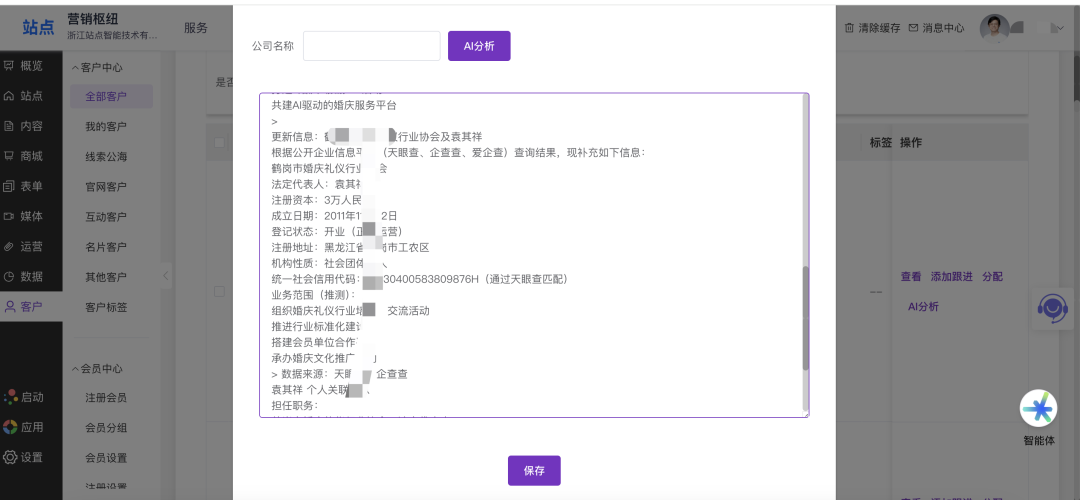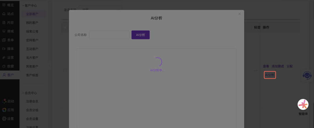 在对文章类型内容增加草稿箱基础上,本次升级我们对公告、活动、常见问题、业务知识、招聘、媒体报道 等几个类型的内容也增加了草稿箱功能。以下图为例,业务知识中的草稿状态的内容、也和文章一样展示了一个‘草稿’标记本次升级对客户管理中的AI分析功能也进行了一些优化。i. 更新操作名称为"AI分析",如下图红框内所示ii. 升级后,点击AI分析时,AI智能体将根据客户详情中的相关信息进行综合分析,而不是之前的根据手动输入公司名称进行分析。比如当这个客户记录是表单提交,包含公司名称字段,使用该AI分析功能,将自动根据公司名称进行公司相关信息的获取。操作路径:官微中心 - 客户 - 全部客户,如下图所示。3) AI智能体功能优化