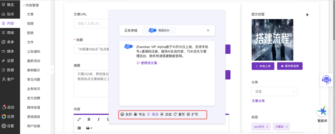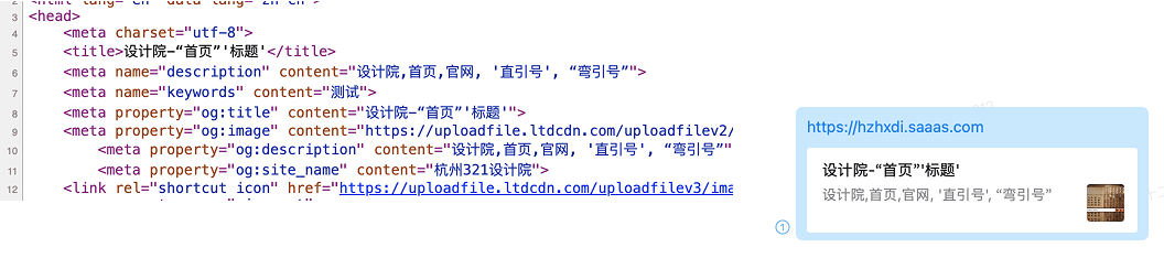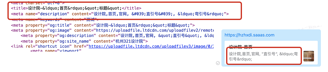 通过摘要生成功能生成文章摘要后,如果对生成的摘要不满意,可以使用下方的二次生成按钮进行 简写 等操作。当页面的标题(Title)和摘要(Description)设置各种类型的引号时,升级前将显示为类似 ” 这样的HTML转码字符,这类字符在浏览器以及大部分使用场合下将正常显示为引号。但是在个别场景(比如企业微信发送链接时)下,这类字符将无法被转义,导致引号无法显示,如下图所示:本次升级对网站编辑器页面输出针对这个场景做了一些优化,一些引号字符进行直接输出,让上述场合显示的准确率更高。04