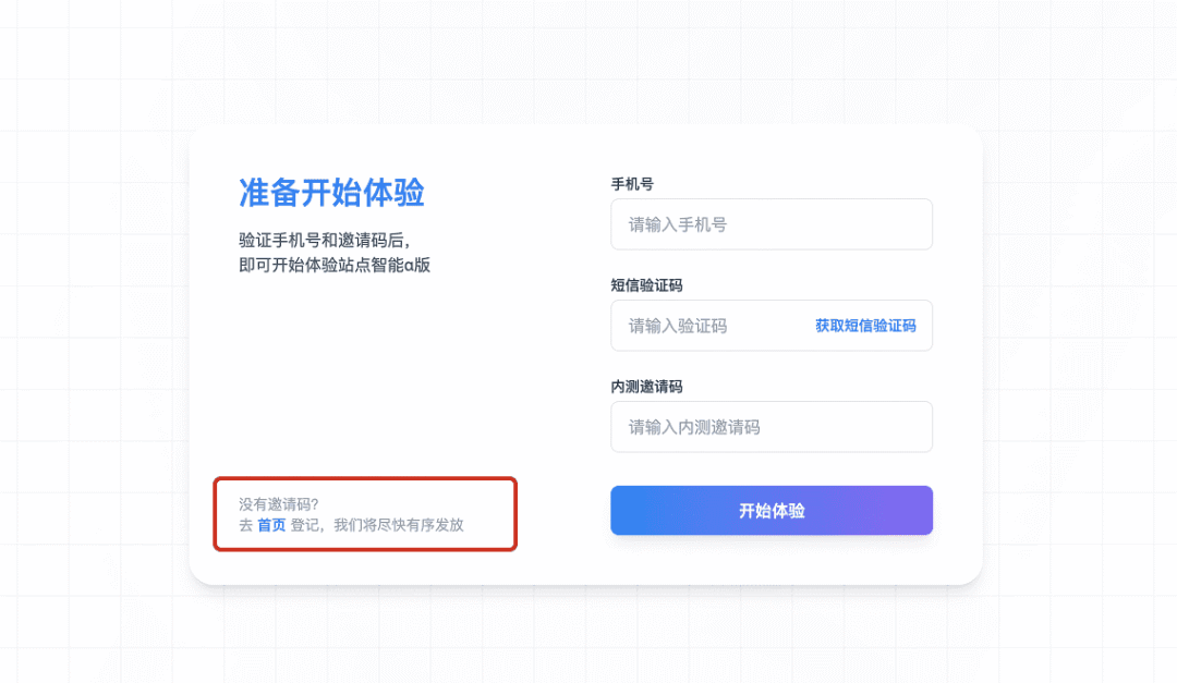 暂未获得邀请码的用户,可以通过此处领取不定期放出的少量邀请码i. 优化登录页面短信发送功能,减少短信验证码无法发送的问题。iv. 优化邀请码验证流程,避免部分情况下无法验证通过的问题。v. 优化首页登记流程,通过首页登记的用户,领取内测邀请码将更加及时。05