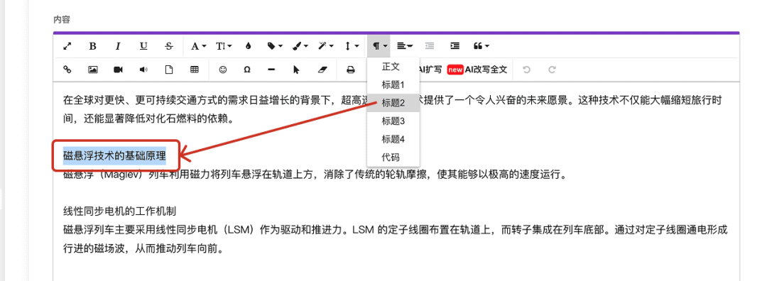 修复前,当编辑内容时,如果文字被设置为标题1、标题2等标题样式,在编辑器中无法和普通的正文样式做区分。导致发布后出现文字内容过大(显示为标题样式)等情况
