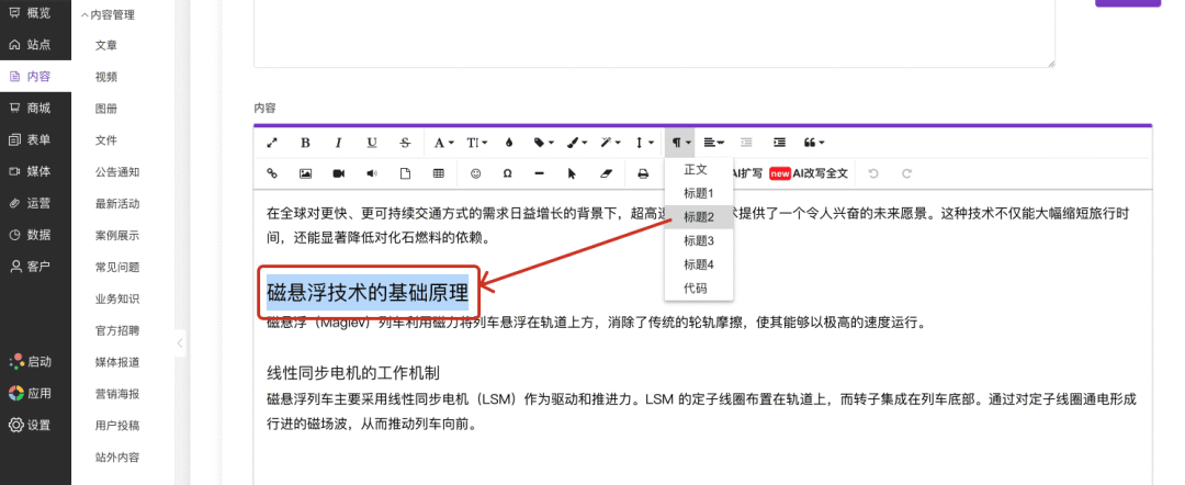 比如此时我们发布后,这些标题实际上会显示为标题样式本次升级我们对这种情况做了修复,增加了内容编辑器中的标题样式,这样在编辑时,就可以和正文字号相区分了:3. 增加Google API推送栏目(即将上线)2) 表单编辑器