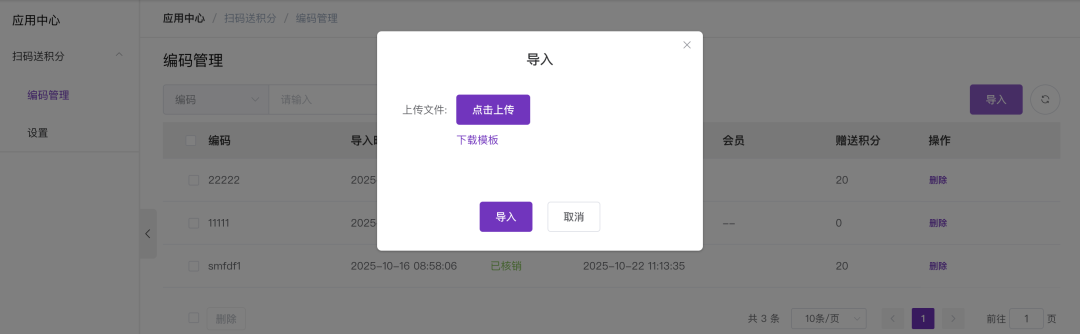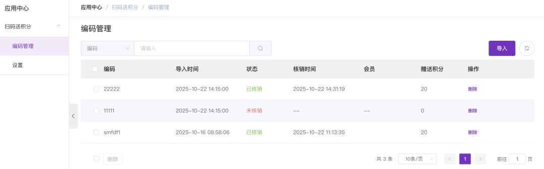 操作路径:官微中心 - 应用 - 扫码得积分,如下图所示。通过右上角的导入按钮,可以批量导入你的编码数据。此编码为线下商品二维码或者条码里包含的编码数据。用户的扫码核销(获取积分)记录,可以通过编码管理中的状态 列查看,如下图所示: