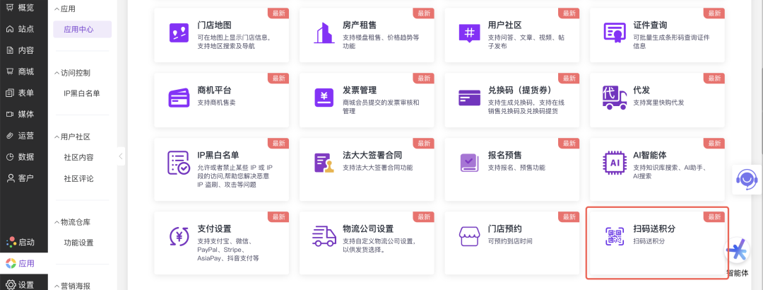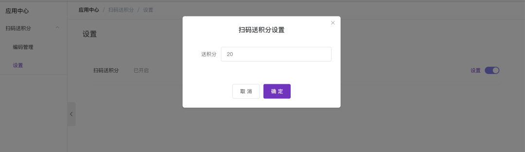 针对已经开展线下一物一码(每个产品上印刷上唯一的二维码/条码)的用户,本次升级我们增加了一个扫码得会员积分的应用。利用已经印刷/发放的一物一码数据,将其导入到应用后台,即可实现扫码得积分。用户通过个人中心等入口进入扫码界面,用手机扫描一物一码对应的码(比如二维码),如果码中的数据在后台有对应记录,即可获取到积分。