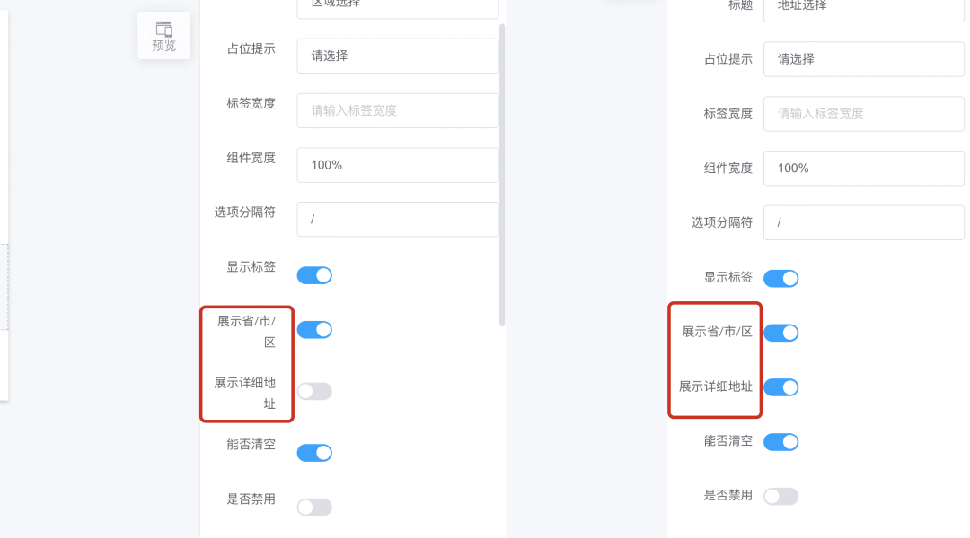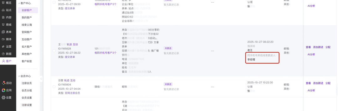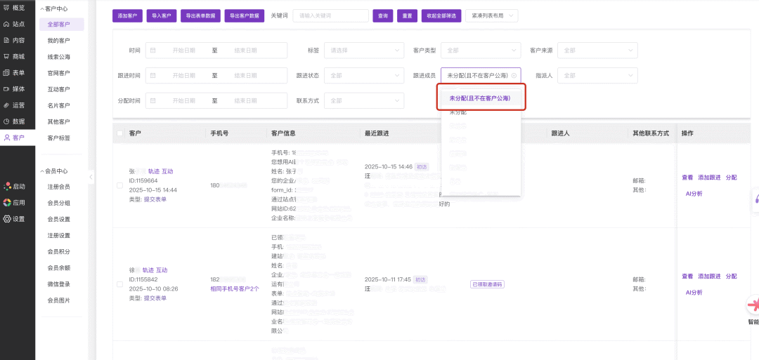 当出现比如同一个用户提交了不同表单、每个表单包含相同的手机号,或者通过这个手机号注册了会员等情况时,客户管理中将会出现相同手机号的多条线索。为了避免同一个人(相同手机号、不同线索)被分配给不同跟进人的情况,本次升级我们针对该情况做了一些优化。如下图所示,在 跟进人 一栏,如果同手机号的其他线索已经分配了跟进人,再此处将会显示 "同手机号其他线索跟进人" 的相关记录。在分配跟进人时,这些数据的展示将提供一些分配参考。2) 客户管理:增加没有分配跟进人且不在客户公海的筛选在客户管理中筛选"未分配"时,默认将筛选出没有分配跟进人或者在客户公海里的线索。为满足仅筛选出没有分配跟进人的情况,新增了一个"未分配(且不在客户公海)"的选项,可以筛选出这类线索。为满足部分情况下只需要用户提交"所在区域"的需求,本次升级为地址组件增加了一个 是否展示详细地址 的选项。该选项默认为开启:地址组件将显示 区域选择 与 详细地址 两个输入框。如果选择关闭后,该地址组件将只显示 区域选择 的输入。从 "展示全路径" 调整为和实际作用更加符合的 "展示省/市/区"该设置默认开启(用户选择区域后,会显示为 省/市/区)。如果关闭该设置,则用户选择区域后,就会仅显示最后一级的区域(比如xx区)本次升级为地址组件中的详细地址输入框增加了占位提示。升级后,输入框内会显示一个占位提示(请输入详细地址):升级前,使用付费表单时,下方的付费项目(商品)选择下拉框中默认为没有选中商品。升级后,此处将显示一个商品(付费选项),让用户能够知道此处是可以选择的。优化右侧的字段配置界面的选项标题宽度,避免部分过长的标题显示为两行。04
