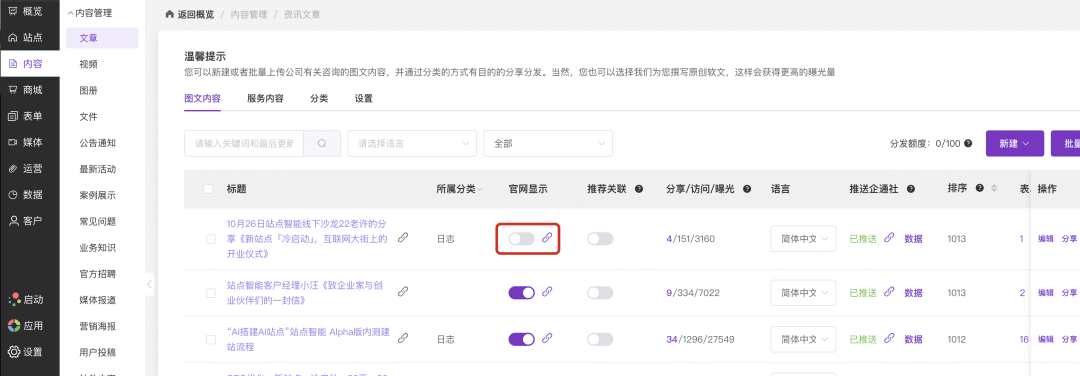 部分情况下,当一篇内容选择关闭"官网显示"(如下图红框内开关所示)后,编辑这篇内容并重新保存时,官网显示开关会被自动打开。