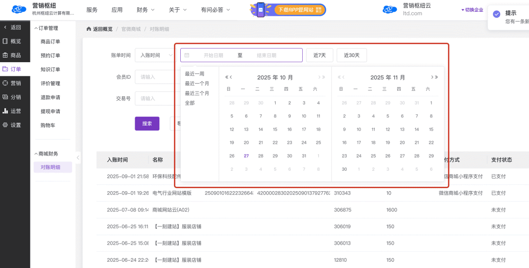 操作路径:官微中心 - 商城 - 订单 - 对账明细