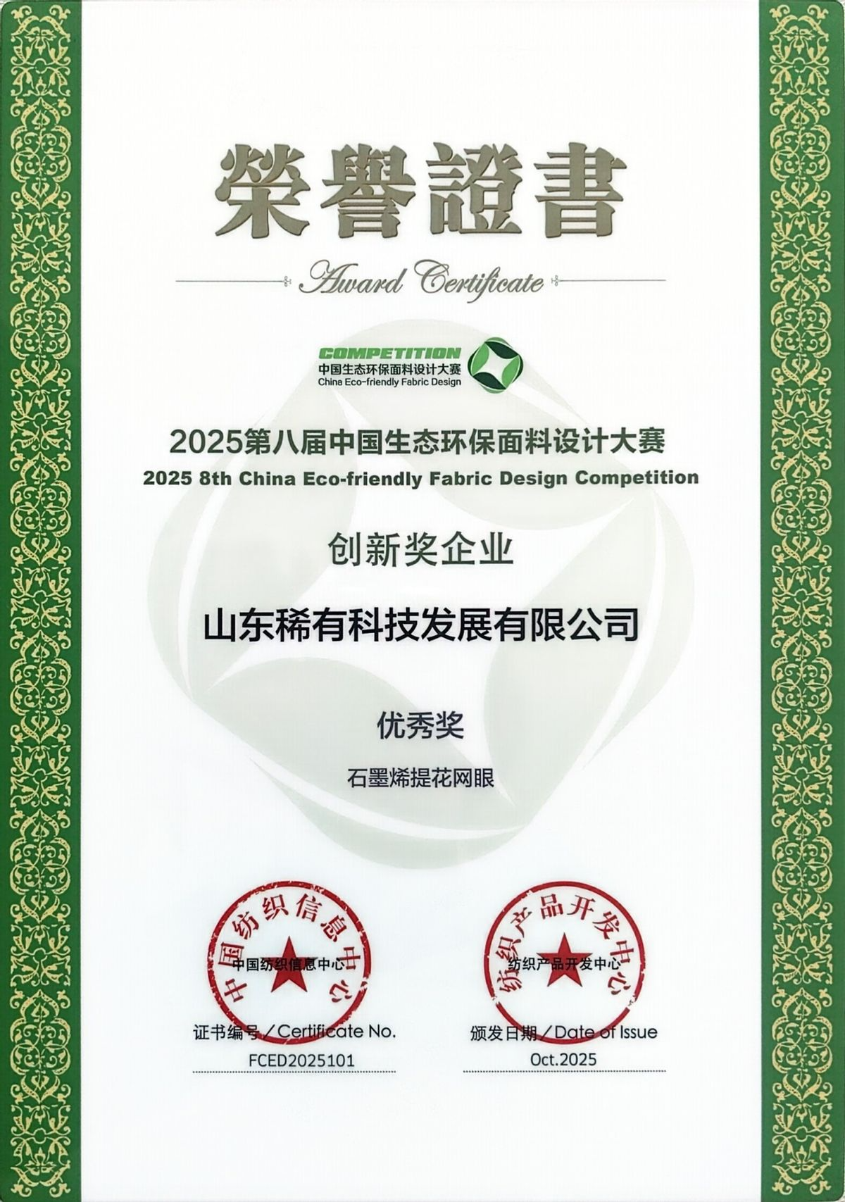 近日,2025第八届中国生态环保面料设计大赛颁奖典礼在江苏盛泽举行。山东稀有科技发展有限公司(以下简称“稀有高科”)自主研发的启脉石墨烯提花网眼面料,凭借在生态环保与功能创新维度的系统性突破,成功获评“创新奖企业-优秀奖”,为纺织产业绿色转型贡献了重要实践成果。该赛事作为纺织行业生态环保领域的权威评选活动,其评审结果对产业发展具有重要导向意义。