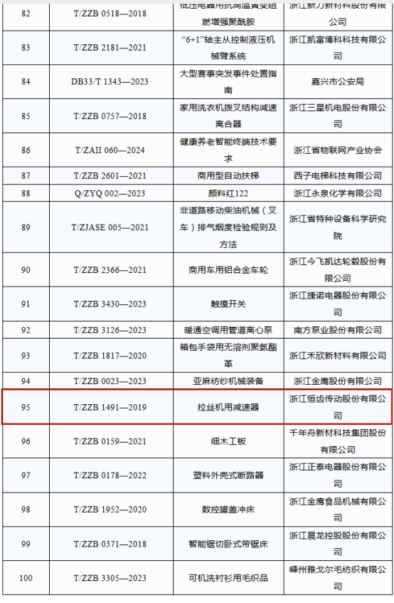 浙江恒齿传动股份有限公司(以下简称“我司”)在精密齿轮加工、高强材料应用等标准化建设和技术创新应用做出众多突出成就,其中我司制定的T/ZZB 1491-2019《拉丝机用减速机》荣获浙江省市场监督管理局颁发的2025年“浙江标准”荣誉。这是我司在标准化建设与技术创新领域取得的又一重大突破,标志着我司在细分产品领域的技术实力与标准引领地位获得了权威认可。