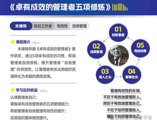 本训练体系以“让管理者卓有成效 ”为实训目标,结合现代管理学之父彼得·德鲁克的管理思想,辅以企业教练、经验萃取、行动学习等训战工具,专门针对企业管理层,即知识工作者而设计,推动知识型组织传承和实践德鲁克的管理实践,打造高绩效的现代组织,实现企业人才培养的可落地,可实施,可操作,可复制。打造真正懂管理的铁军团队。