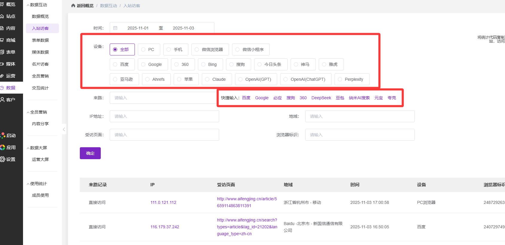 后台数据数据统计将市面上比较热门的蜘蛛类型全部识别,可以轻松查看来源网站的类型,更好的管理网站访客数据。更支持查看ai工具的抓取结果显示。