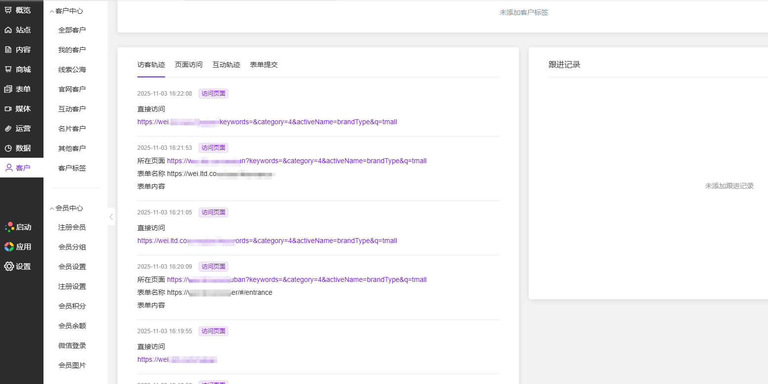 具备客户scrm管理后台功能,能够查看到客户的访问轨迹,销售可以根据情况进行跟进并且随时可以填写跟进记录。