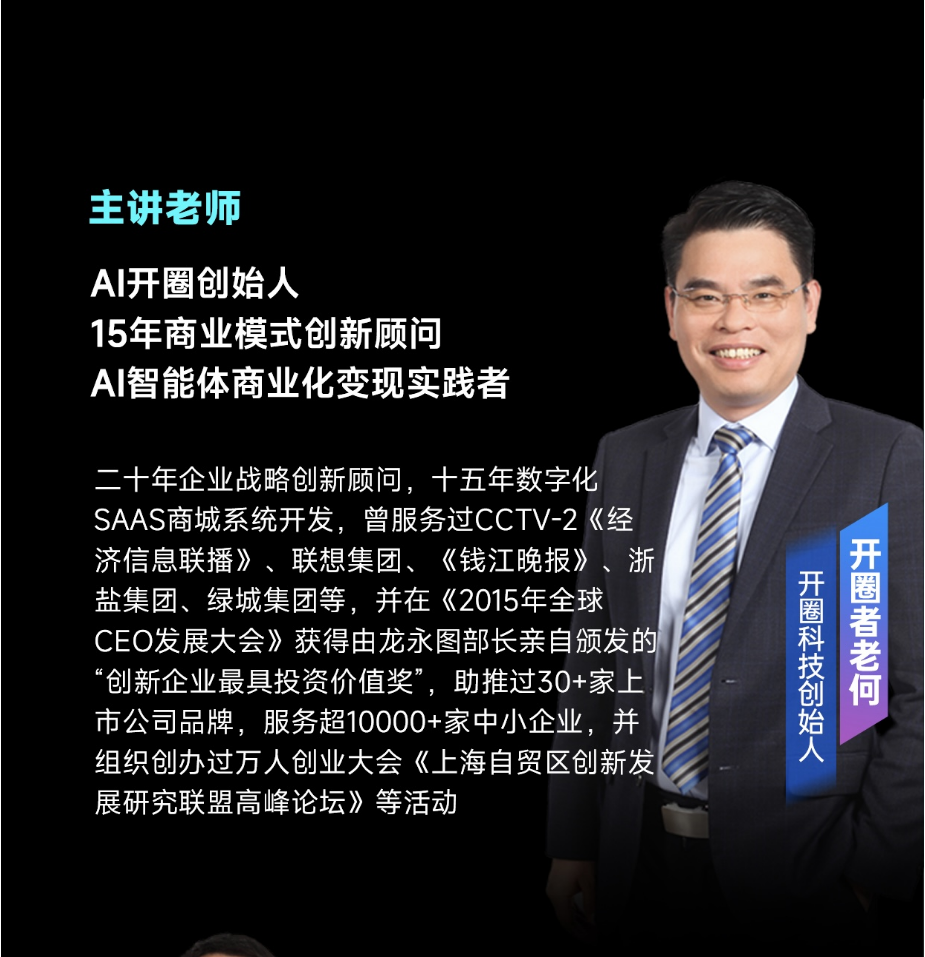 那什么是智能体?智能体和大模型有什么区别?智能体有什么用?智能体是怎么工作的?企业如何找到智能体商业落地应用的场景?如何让智能体成百上千倍提升工作效率、降本增效?如何让智能体赋能你的业务,实现业绩增长?是不是听了很多课,看了很多的视频还是一头雾水?是不是还是不知从何下手,不知道怎么落地?……