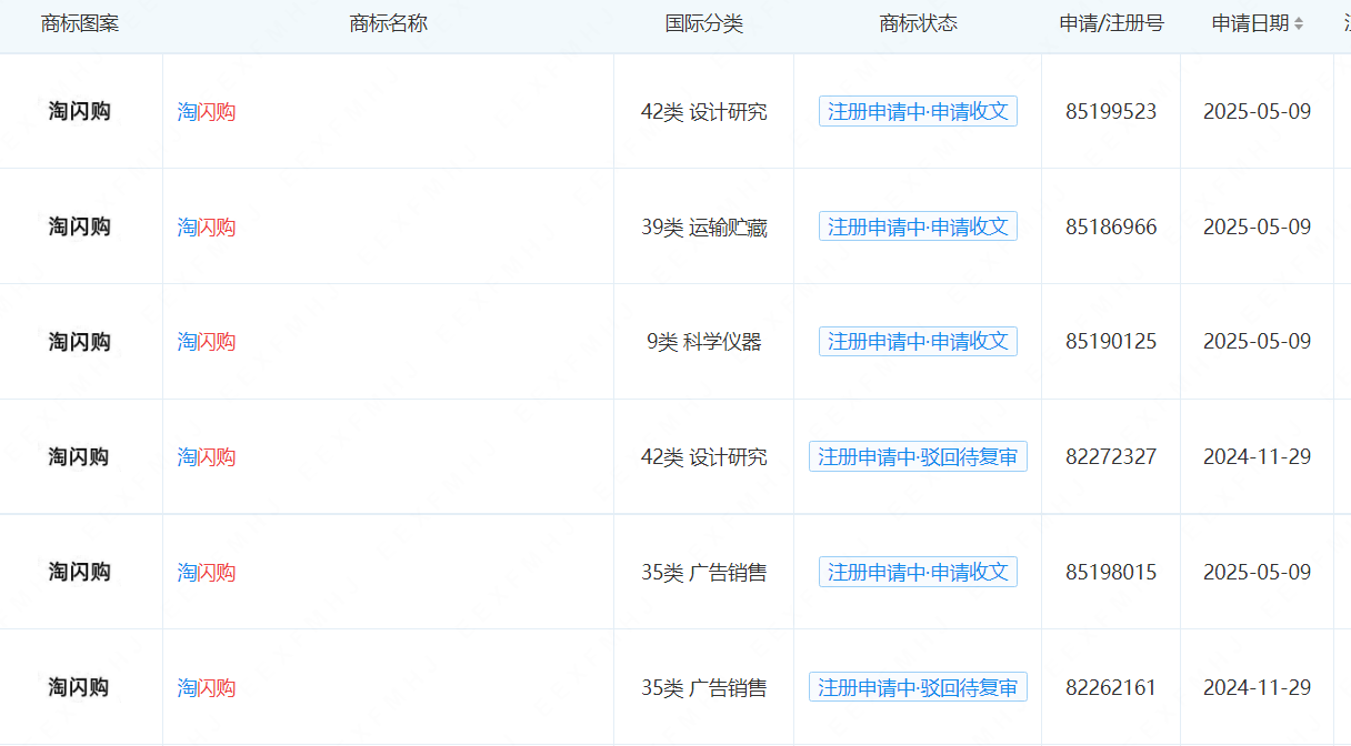 2025年以来,阿里巴巴(中国)有限公司已申请“淘闪购”“TAOBAOSHANGOU”“淘宝闪购 点外卖更优惠”等多枚闪购系列商标,涉及广告销售、网站服务等领域。