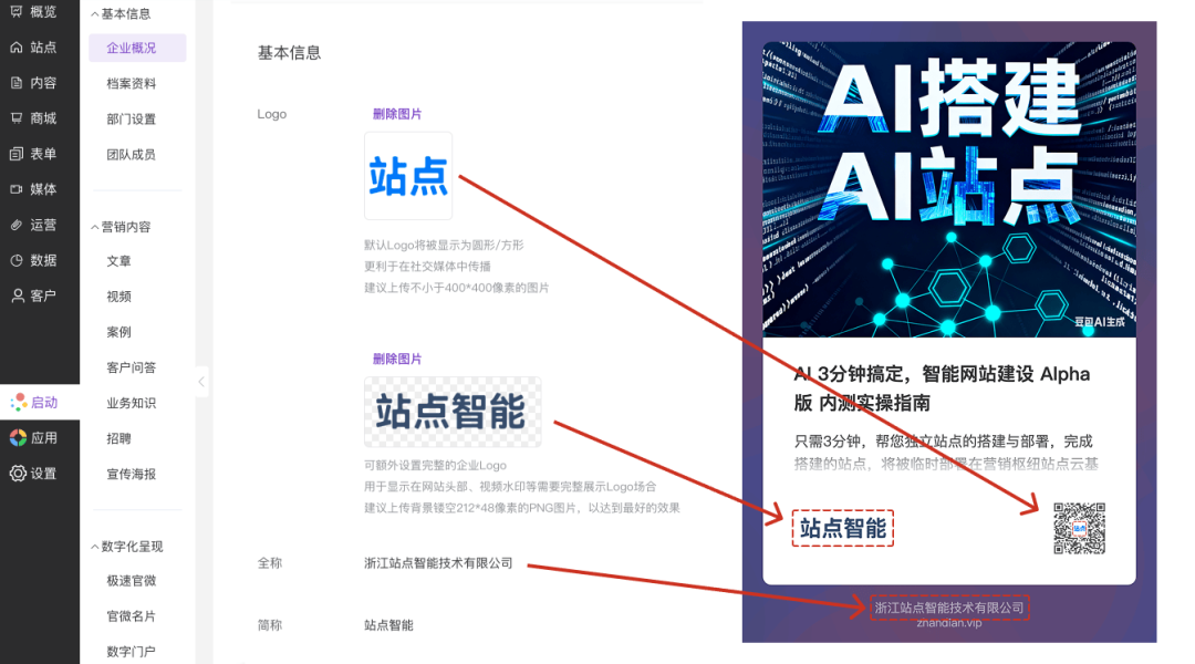 左下方企业Logo: 将优先取用企业的"完整Logo",如果没有设置完整Logo,则将使用方形的企业Logo 二维码中间的Logo: 取用方形的企业Logo 企业名称:取用企业全称字段