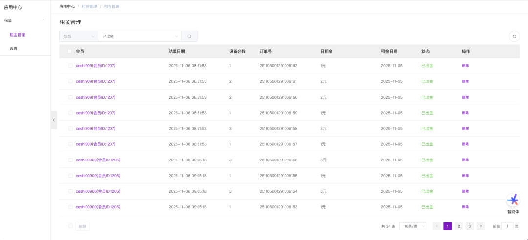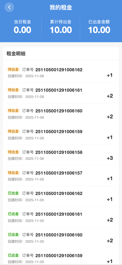 在“我的租金”实时展示当日租金、累计待出金金额、已出金金额,每日更新租金明细(含日期、出金状态、订单号、金额)。