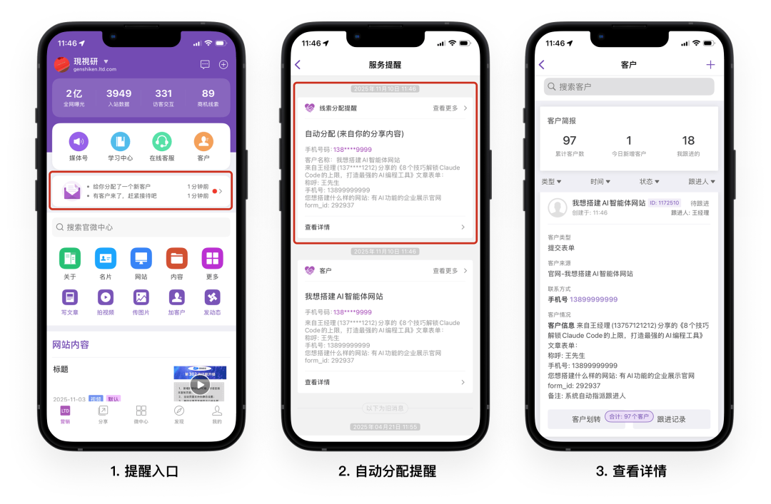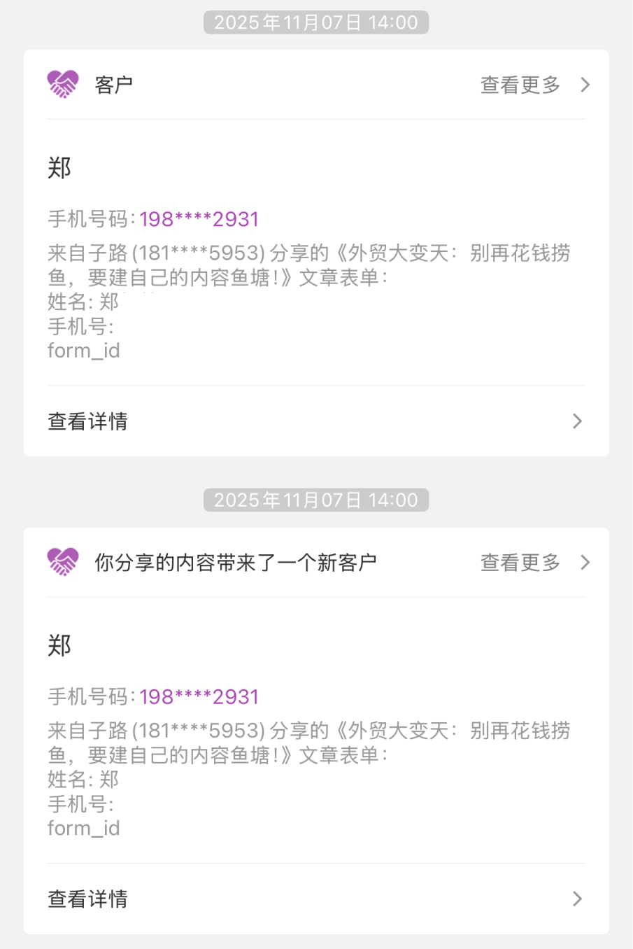 1. 自动分配线索提醒: 标题为 你分享的内容带来一条新客户