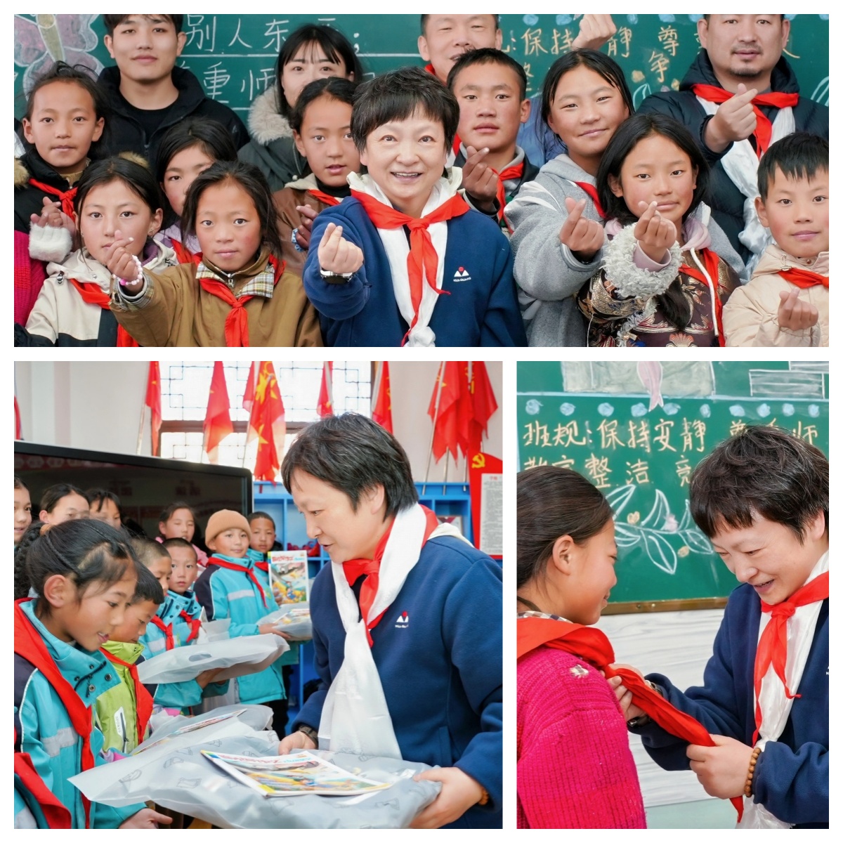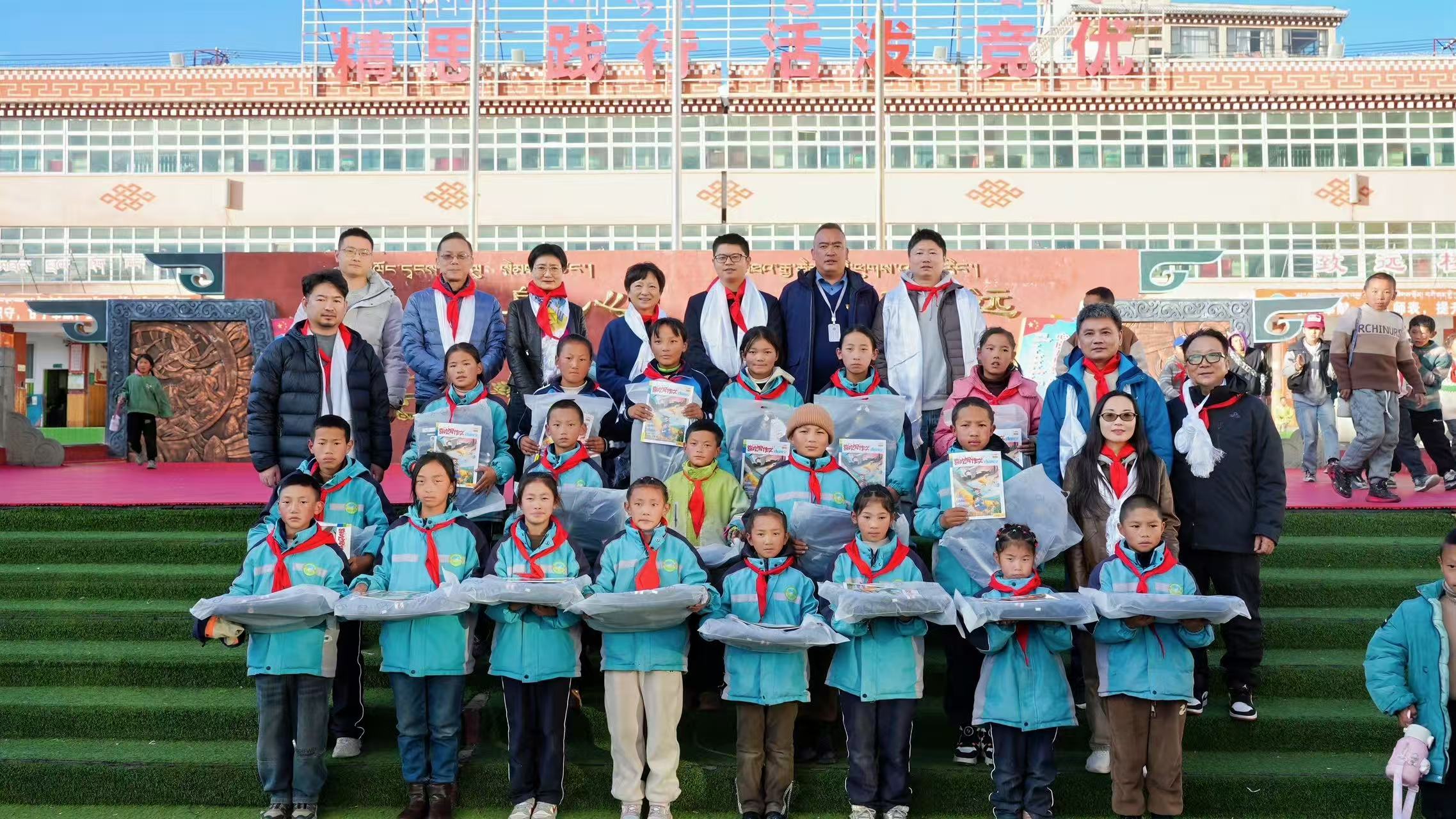 捐赠活动在校园铺展开来,暖意漫过高原的寒风。操场之上,孩子们身着整洁校服,排着整齐的队伍,小脸上满是期待与欣喜。华光新材董事长金李梅亲手将崭新的书包、文具套装递到每个孩子手中,指尖传递的不仅是物资,更是跨越山海的关怀。“要好好读书,去看看更大的世界呀!”金李梅董事长轻声叮嘱,孩子们用力点头,稚嫩的“谢谢”声清脆响亮,在蓝天白云下久久回荡。拿到礼物的孩子迫不及待地打开书包,互相分享着崭新的笔记本与彩色画笔,眼眸中闪烁着对美好事物的向往。