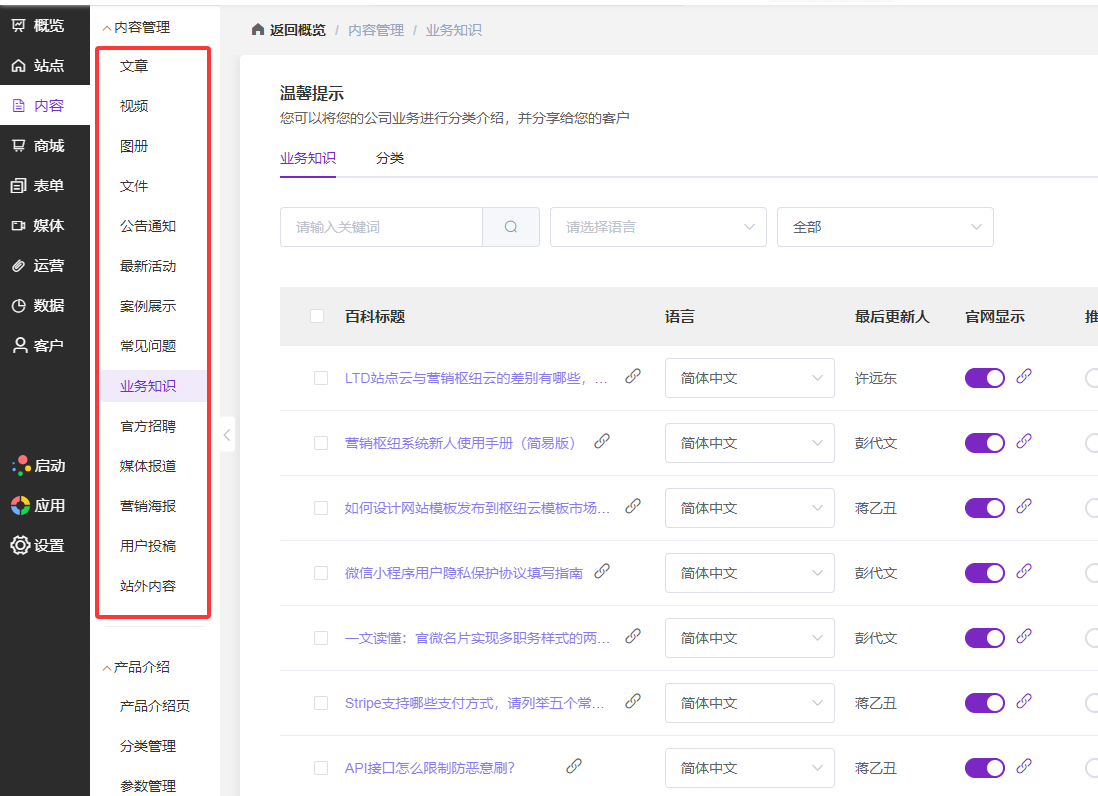 - 重构内容架构:摒弃单页面优化思维,搭建企业知识图谱。使用具有营销管理属性的后台进行内容管理最佳选择: